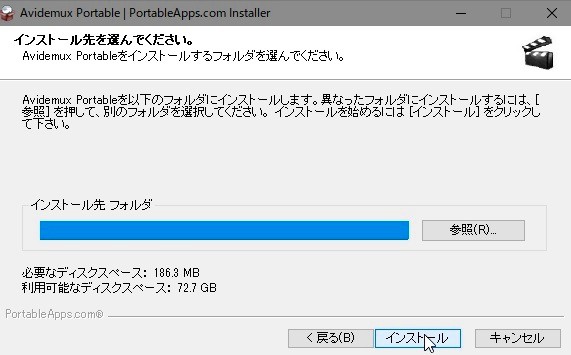 インストールしたいフォルダを選択し、「インストール」をクリック。