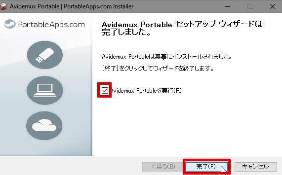 インストールが終了したら、「Avidemux Portableを実行」にチェックを入れ、「完了」をクリックします。