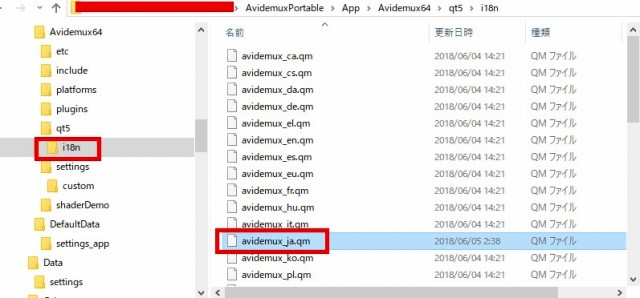 Windows10(64bit)の場合、解凍したフォルダ内の「avidemux_ja.qm」を、