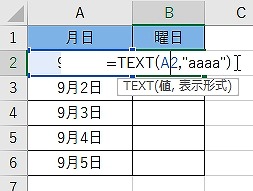 | 日曜日 | =TEXT(A2,"aaaa") |