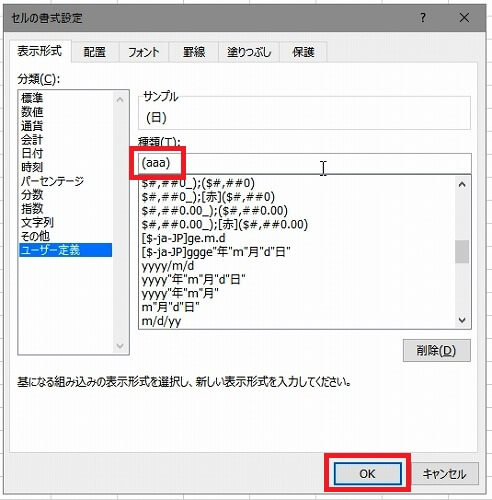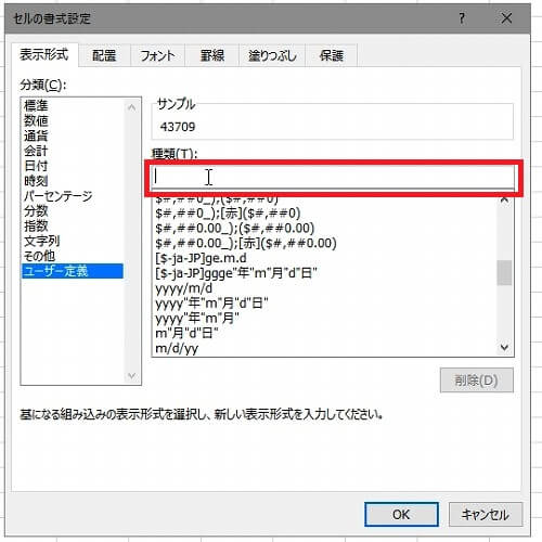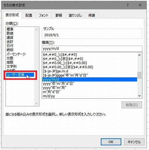 セルの書式設定が開いたら、「ユーザー定義」を選択